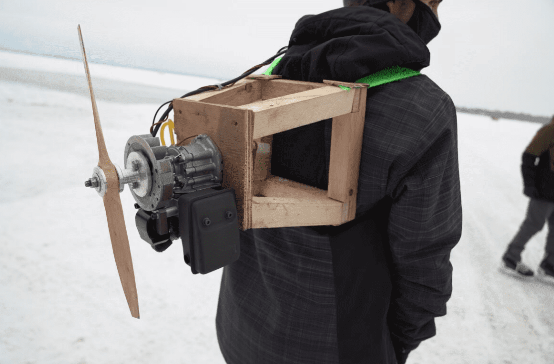 For added safety, Gibson included several features in his latest prototype and advises having another person present when using the device. Since the propeller is strapped to the user’s back, accessing it alone is nearly impossible. Starting the device requires manually spinning the propeller, using an old-fashioned recoil starter.