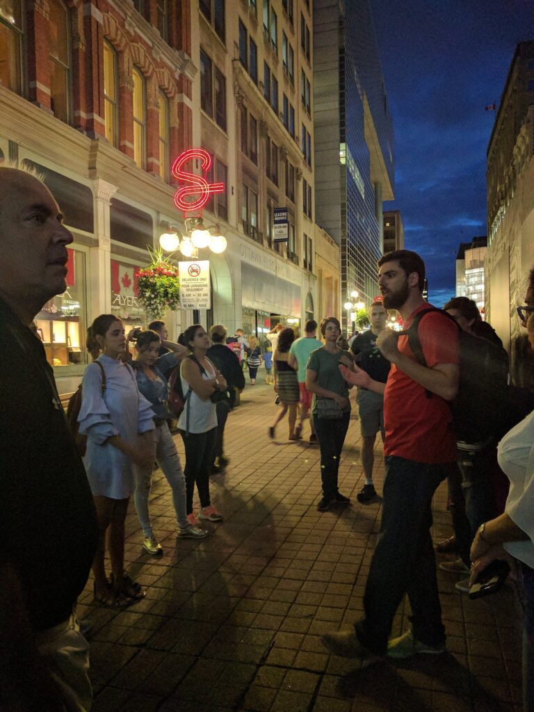 - Безкоштовний тур Оттавою після настання темряви. Сама назва уже інтригує, адже всі знають, що після настання темряви починається найцікавіше. Тож що відбувається після заходу сонця? В рамках екскурсії ви знайдете відповідь на це запитання. Гіди проведуть вас на Парламентський пагорб, а також по центральній частині Оттави, розповідаючи про темні сторони минулого столиці Канади. Завершиться подорож безкоштовним світловим шоу. Влітку (з липня) екскурсії проходять кожного четверга та в суботу. Місце зустрічі — Centennial Flame.